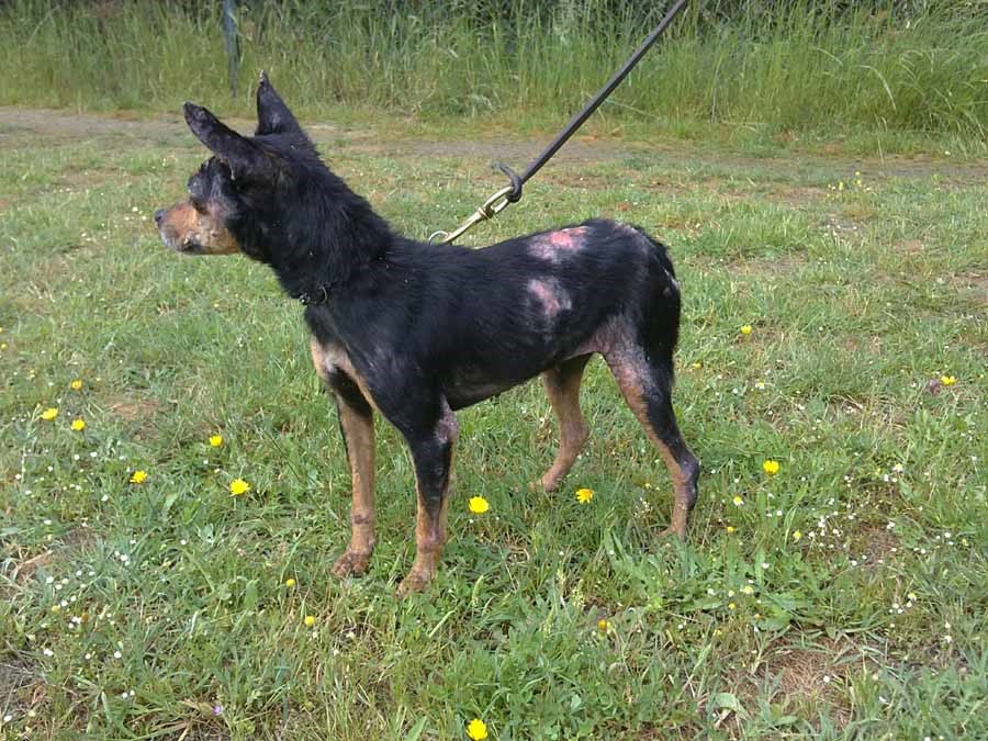 Una semana después de ver su foto hacíamos un viaje de dos horas y media ida y otras tantas de vuelta para recogerla con mis otras perras y estaba preparada para recoger a mi vidita en un estado duro, pero lo que vi me dejo hecha trizas…así estaba 3 meses después de salir de la perrera cuando fuimos a por ella, 4 kilitos de puro hueso, calvas y heridas: